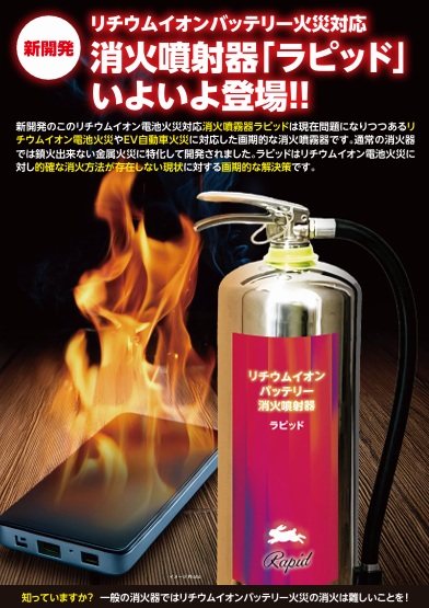 現在問題になりつつあるリチウムイオン電池火災やEV自動車火災に対応した画期的な消火噴射器です。